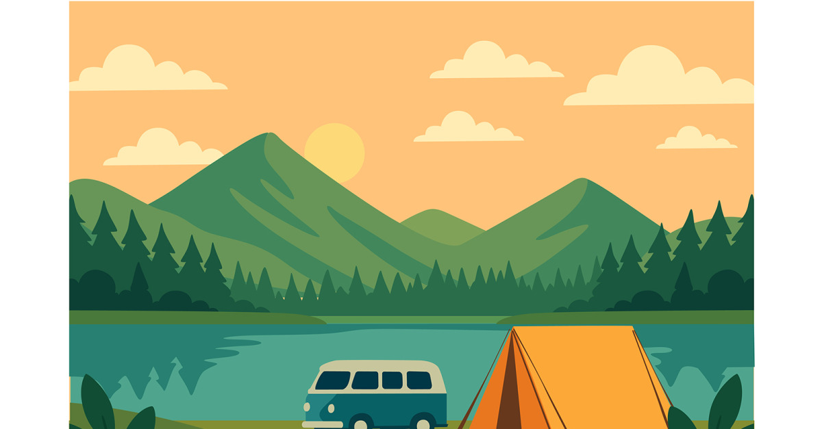 File Included : AI (CS6)EPS10Image 4000 x 3000 (px) **Experience adventure and exploration with this serene lake illustration, featuring a van and tent as a charming backdrop** **This illustration is created against a backdrop of mountains and trees, capturing the essence of outdoor adventure**