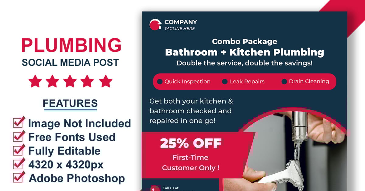 Handyman Plumbing Service Promotion Template for Social Media Marketing Campaigns Designed specifically for plumbing and handyman marketing, this social media post template is a great tool for promoting water pipe fixes, leakage repair, and residential plumbing services. Built in Adobe Photoshop with smart object layers, it’s easy to edit and …